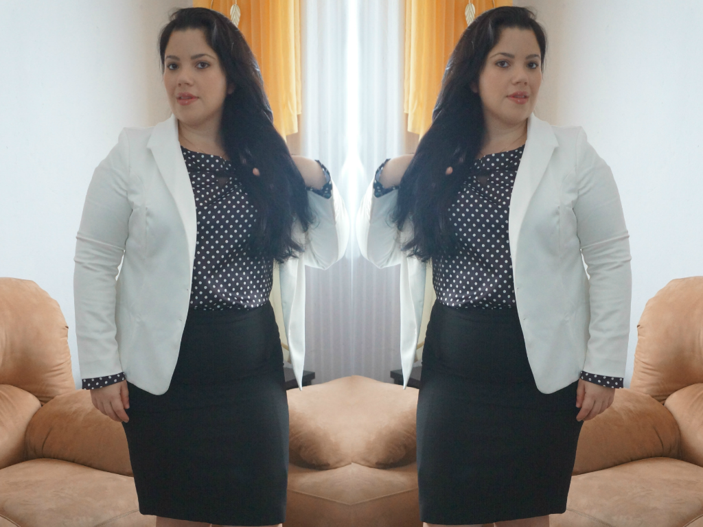 Uma camisa em poá com detalhes em tule no decote e punho, uma saia lápis preta e um blazer branco para sair do óbvio. Para dar uma pitada de cor usei um sapato vermelho.