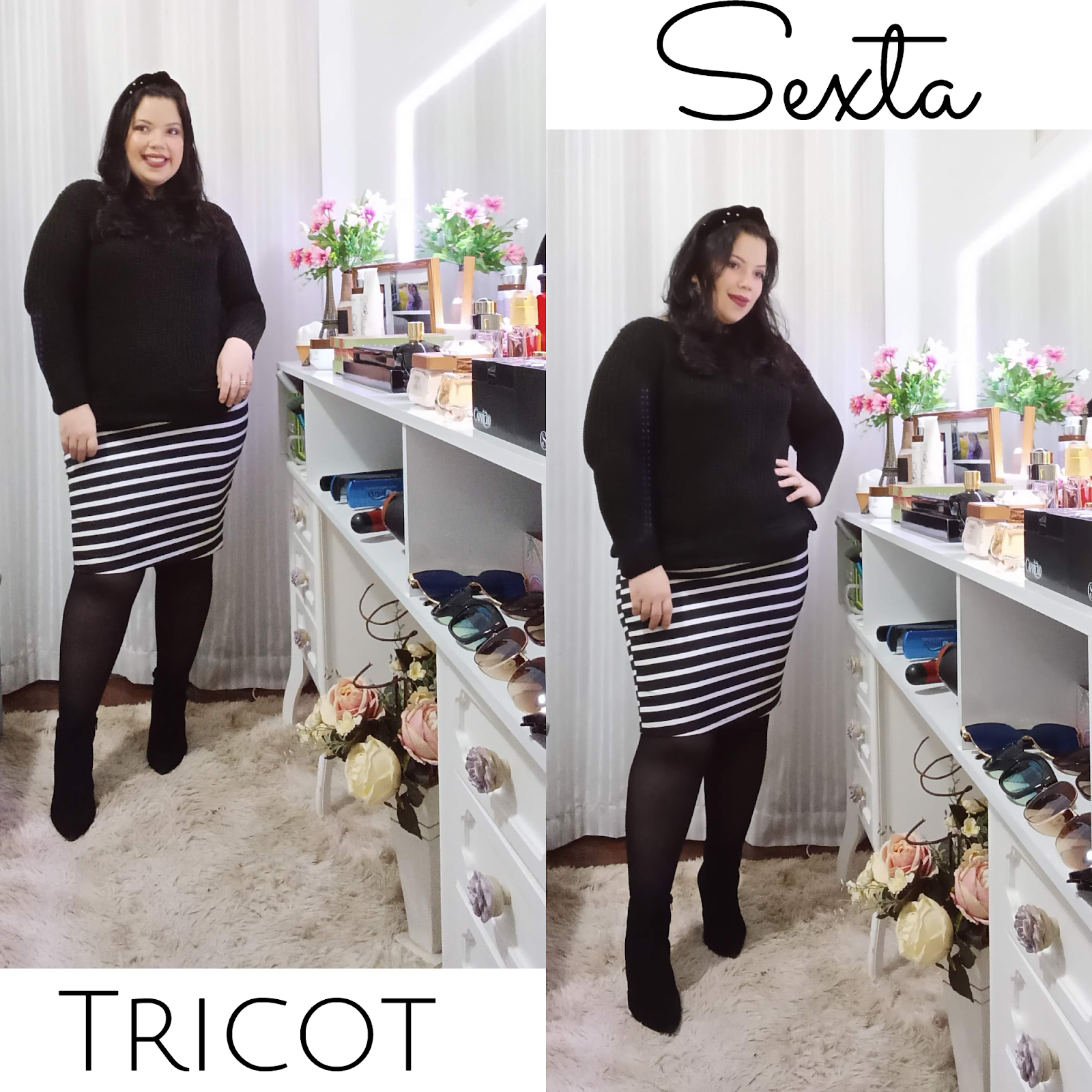 Meu look ficou todo na cartela dos neutros, usei uma blusa em tricô preta e compus com saia justa de listras e arrematei o look com meia-calça e bota de cano curto.
