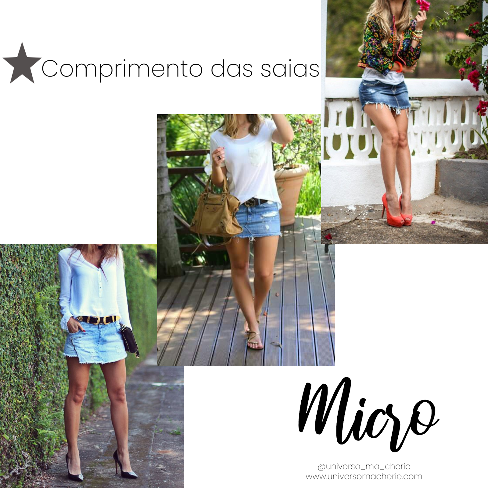 As saias de comprimento micro, como o nome já diz, são aquelas beeem curtinhas, que deixam as coxas à mostra.