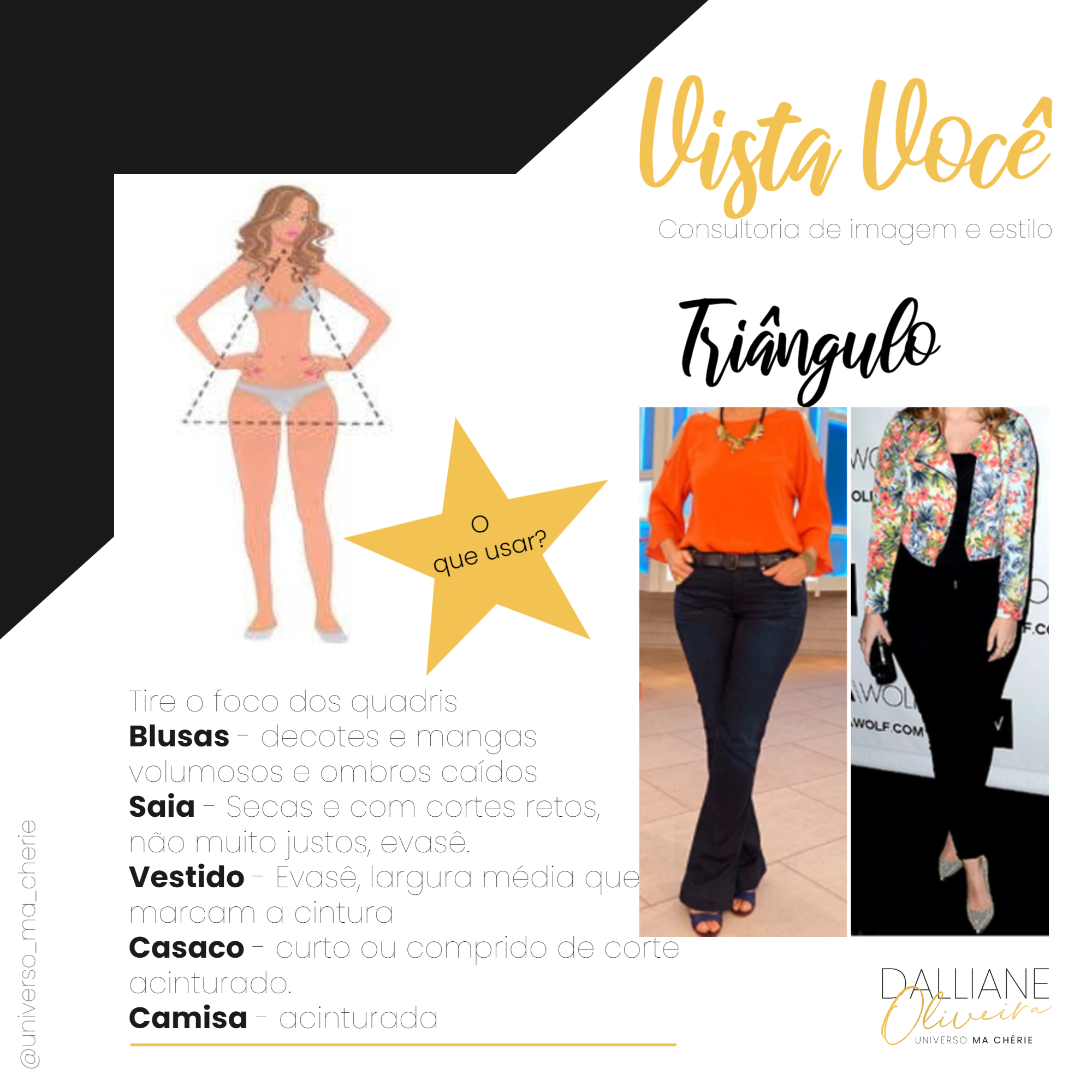 Nesse biotipo, as proporções devem ser criadas na região do quadril, por isso invista em peças com pregas, com roda, saias evasês e godês, calças clochard, crie volume na região dos quadris, atraia a atenção para essa região.