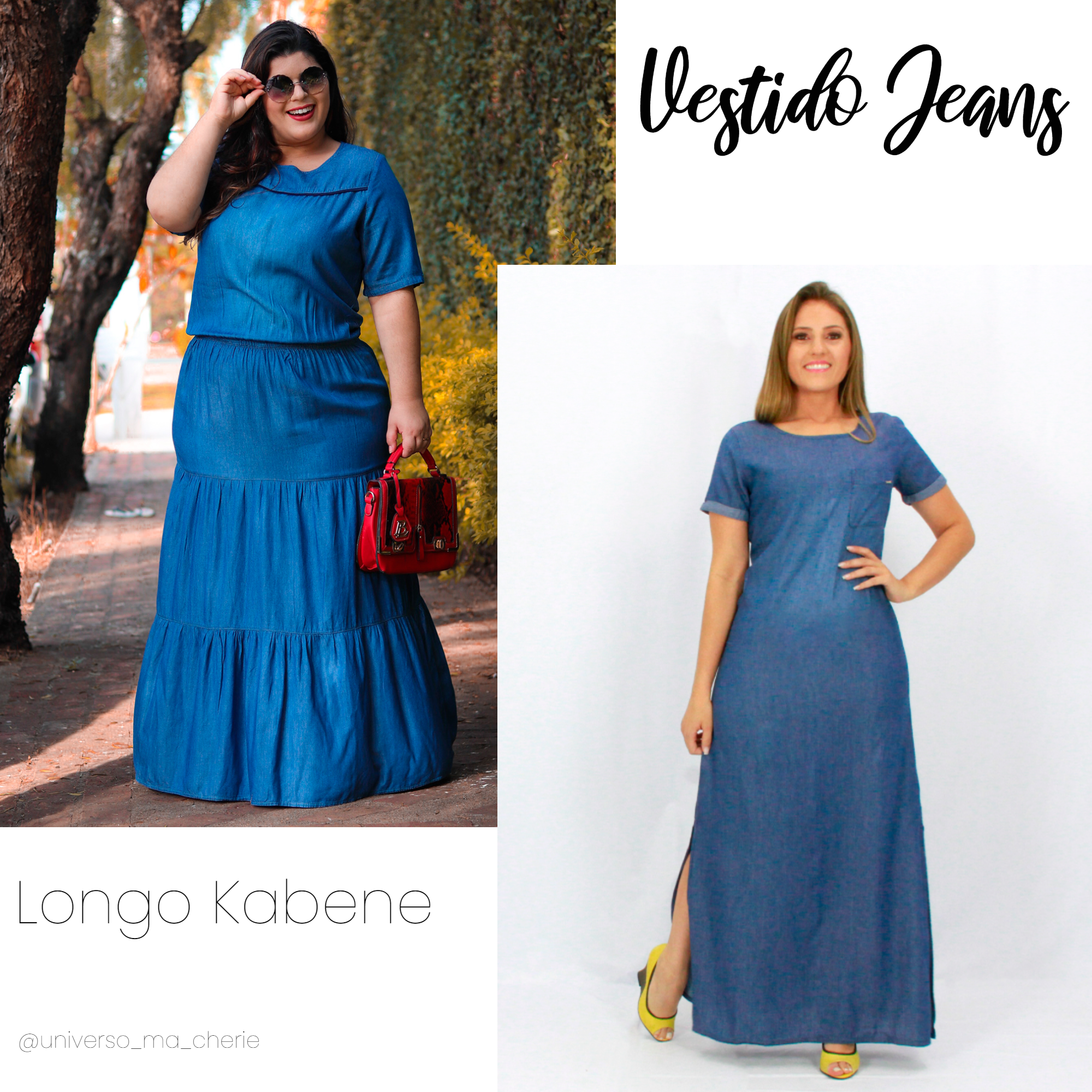 Na foto acima, estou usando o mesmo vestido, em liocel de lavagem jeans com saia 3 marias, mas fiz essa montagem para vocês verem como fica lindo nos dois tipos físicos, o meu com curvas e no outro, um corpo mais magro, dá para ter noção de como o corte e caimento são perfeitos né?!
